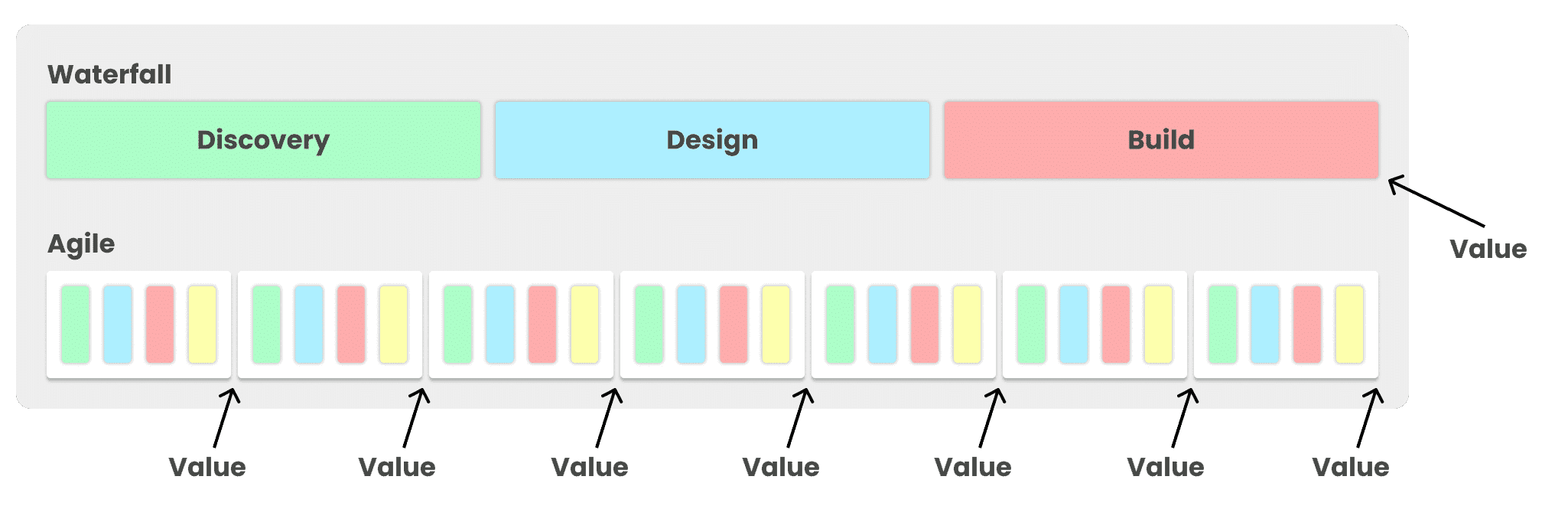 So in both instances, the project could still take the same amount of time to make. But here’s the thing: the agile approach has two massive benefits the waterfall approach doesn’t. To understand that, rather than looking at the overall project timeline, lets instead take a look at when we provided value.